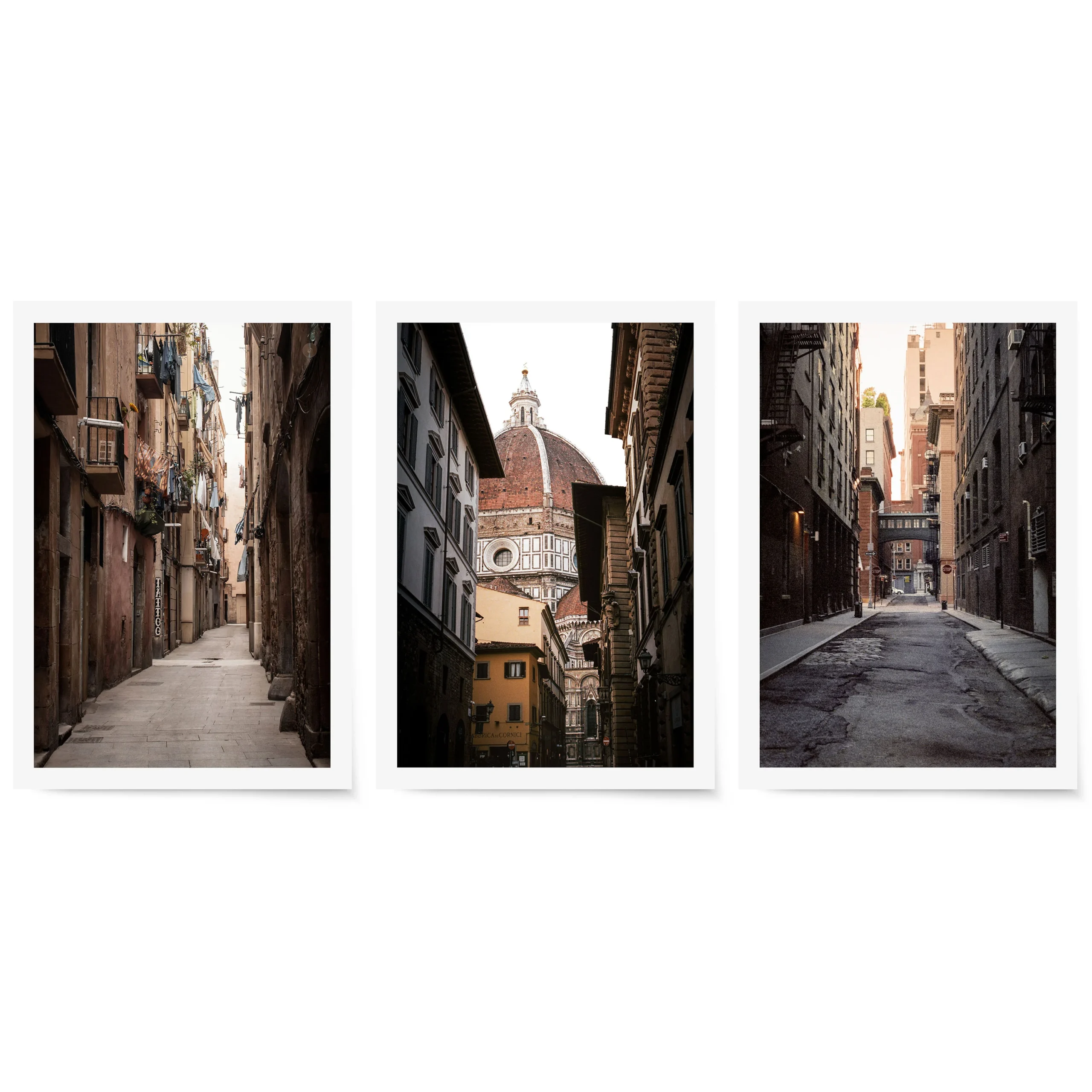 Bring the charm of three iconic cities into your space with this captivating gallery wall set, featuring vibrant streets from Barcelona, Florence, and New York City. Each print highlights the unique architecture and intimate alleys that define these urban landscapes.