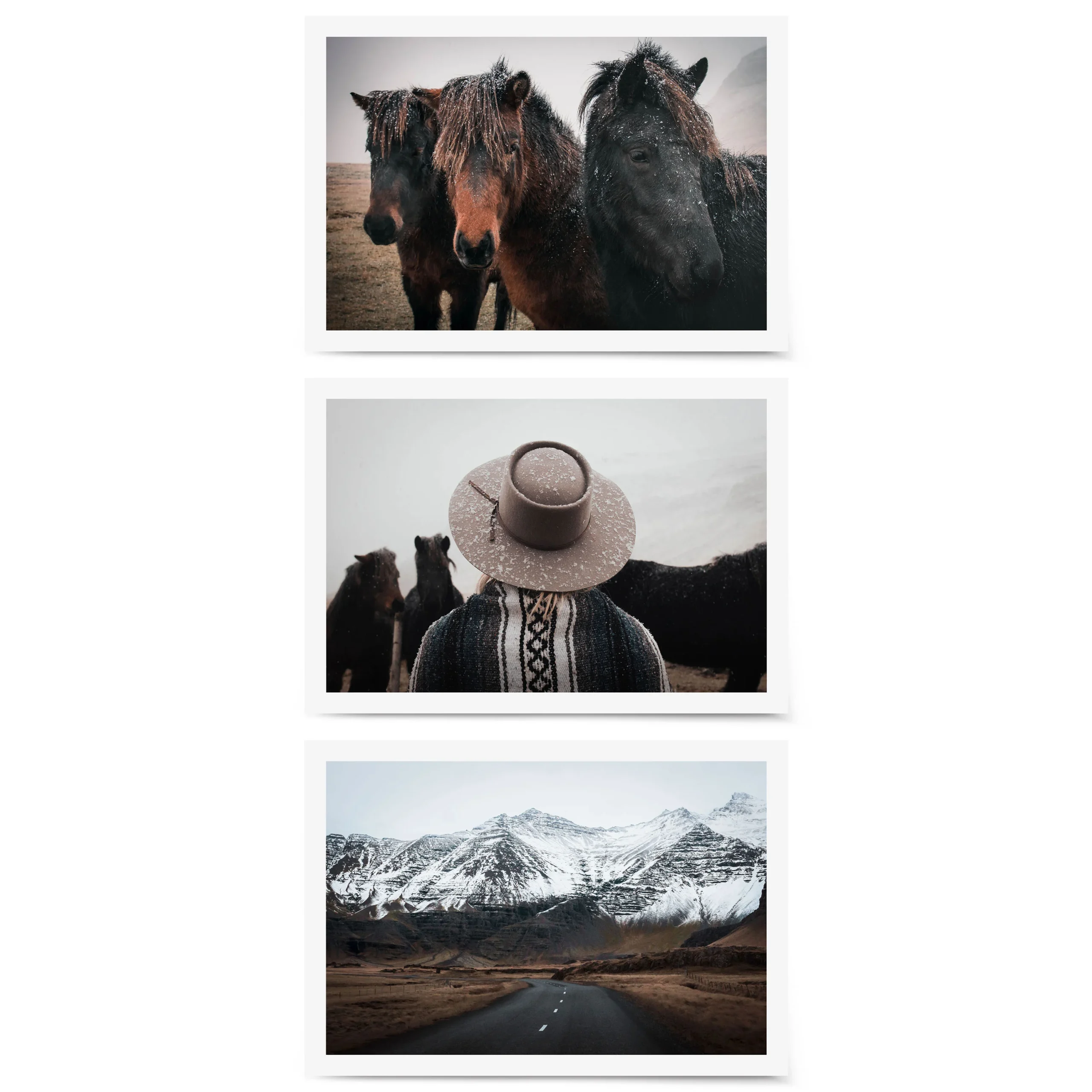 Bring the rugged beauty of Iceland into your space with this captivating gallery wall set. Featuring iconic Icelandic horses dusted with snow, a wanderer’s perspective in a snow-covered hat, and a winding road leading toward breathtaking snow-capped peaks, this collection embodies the untamed spirit of adventure.