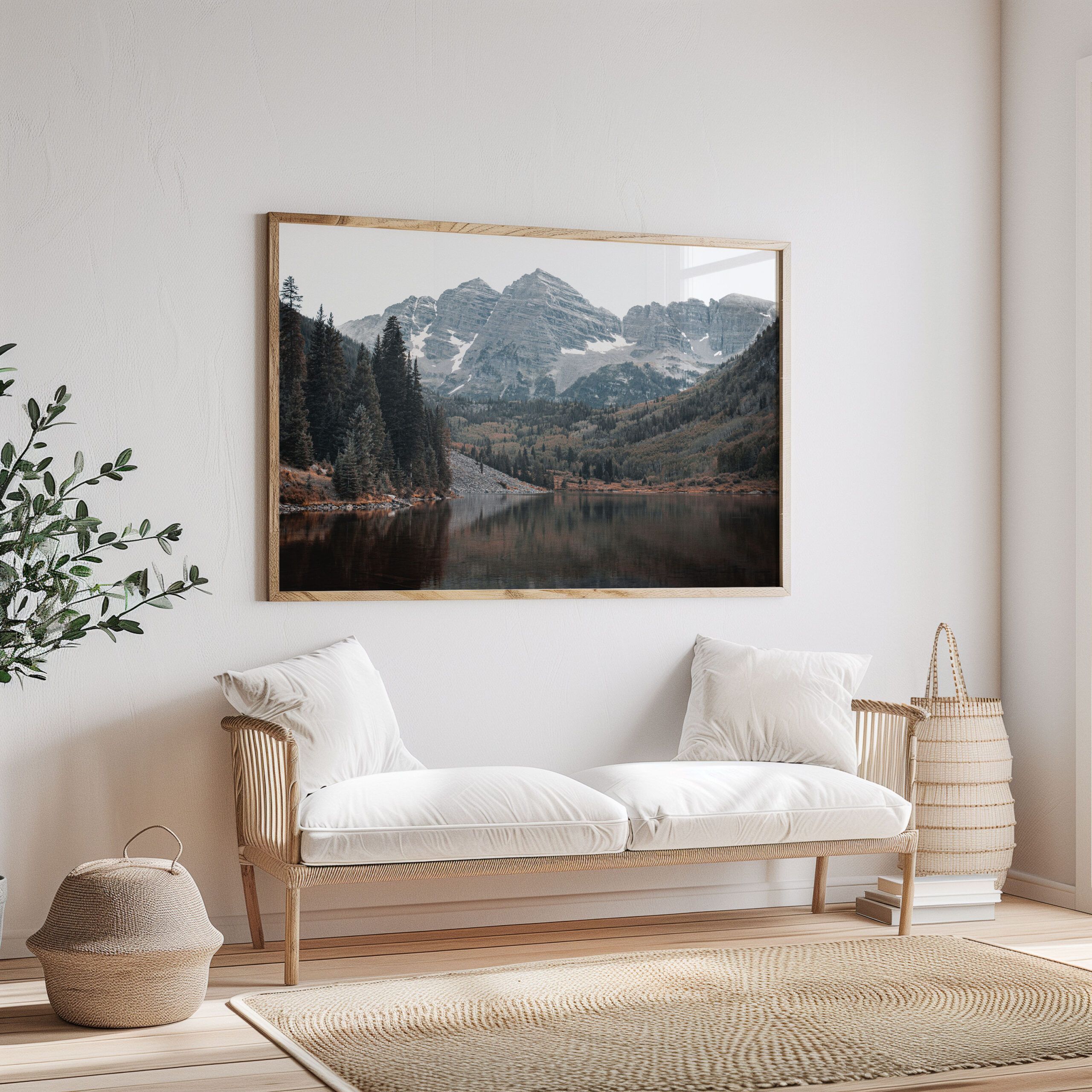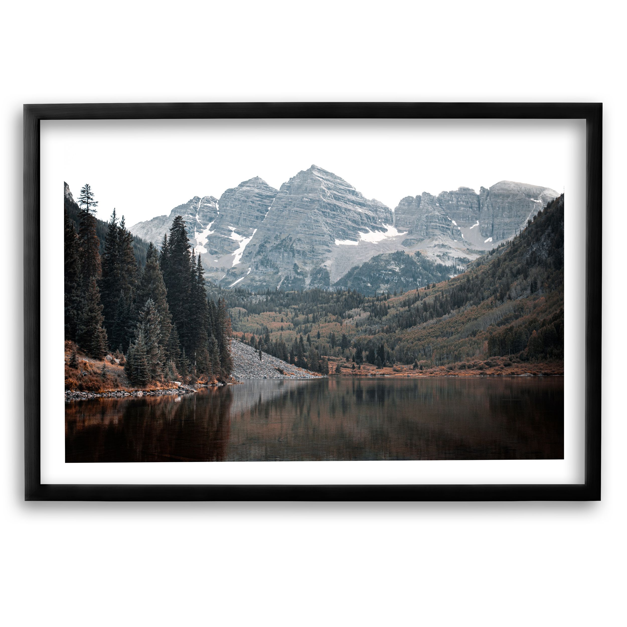 The iconic Maroon Bells reflect in the still waters of a serene alpine lake, framed by vibrant evergreens and rugged peaks. This print captures the breathtaking beauty of Colorado’s wilderness, making it a perfect addition to rustic, mountain-inspired, or modern decor.