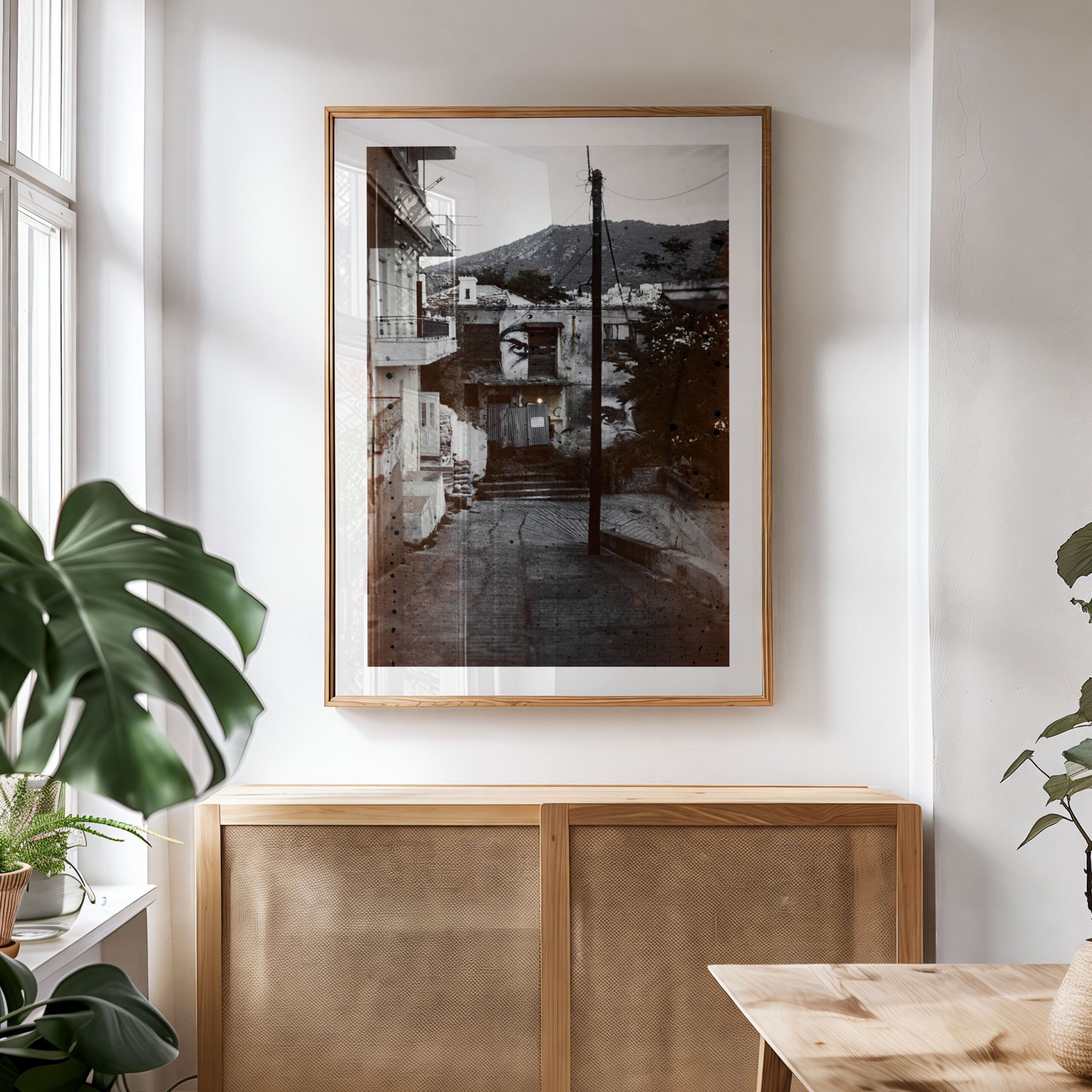 This fine art film photography print captures the quiet mystery of a hidden alley in Greece, where timeworn buildings and urban art collide. The striking mural of a watchful eye emerges from the textured walls, inviting curiosity and contemplation. Set against the backdrop of rugged hills, this piece merges culture and history, making it a thought-provoking addition to your space.